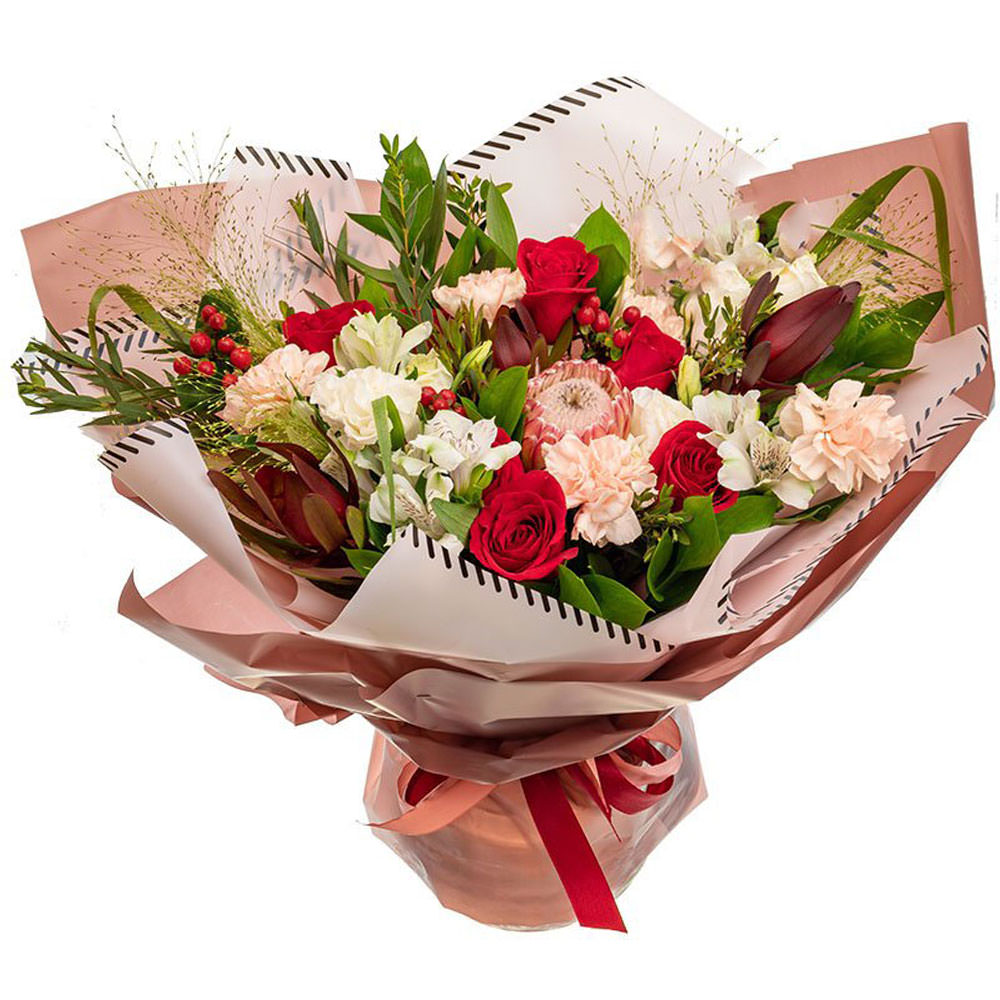 Роза одноголовая, протея, альстромерия, гиперикум, гвоздика, фисташка, зелень.